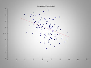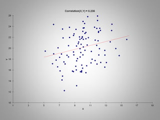 Correlation measures the strength of a linear relationship between two variables on a scale from -1 to 1. A correlation of 0 means there is no linear relationship, 1 means a perfect positive linear relationship, and -1 means a perfect negative linear relationship. Correlation only measures linear relationships and can miss nonlinear relationships. While correlation indicates association, it does not prove causation between the variables. Regression is needed to determine the relative weights and significance of predictors for a dependent variable.