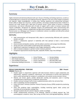 Ray Crook Jr. seeks a position as a mortgage loan processor or underwriter with over 10 years of experience in lending and banking. He has expertise in loan analysis, underwriting techniques, and designing loan structures. Most recently he served as a team lead for a loan servicing company, where he provided training and support to staff. He aims to utilize his strong communication, customer service, and problem-solving skills to contribute to an organization's growth.