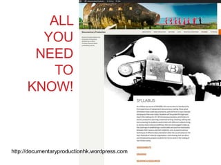 This document outlines the course structure and topics for a documentary production class at City University Hong Kong. The course covers various aspects of documentary filmmaking over 15 weeks, including documentary forms, treatment writing, interview techniques, editing, and post-production. Students will develop a documentary project proposal and treatment, shoot footage, do a final screening, and submit their work by the end of the term. The course aims to teach students the creative process of documenting real stories and exploring diverse approaches to the documentary genre.
