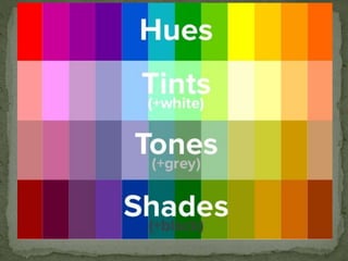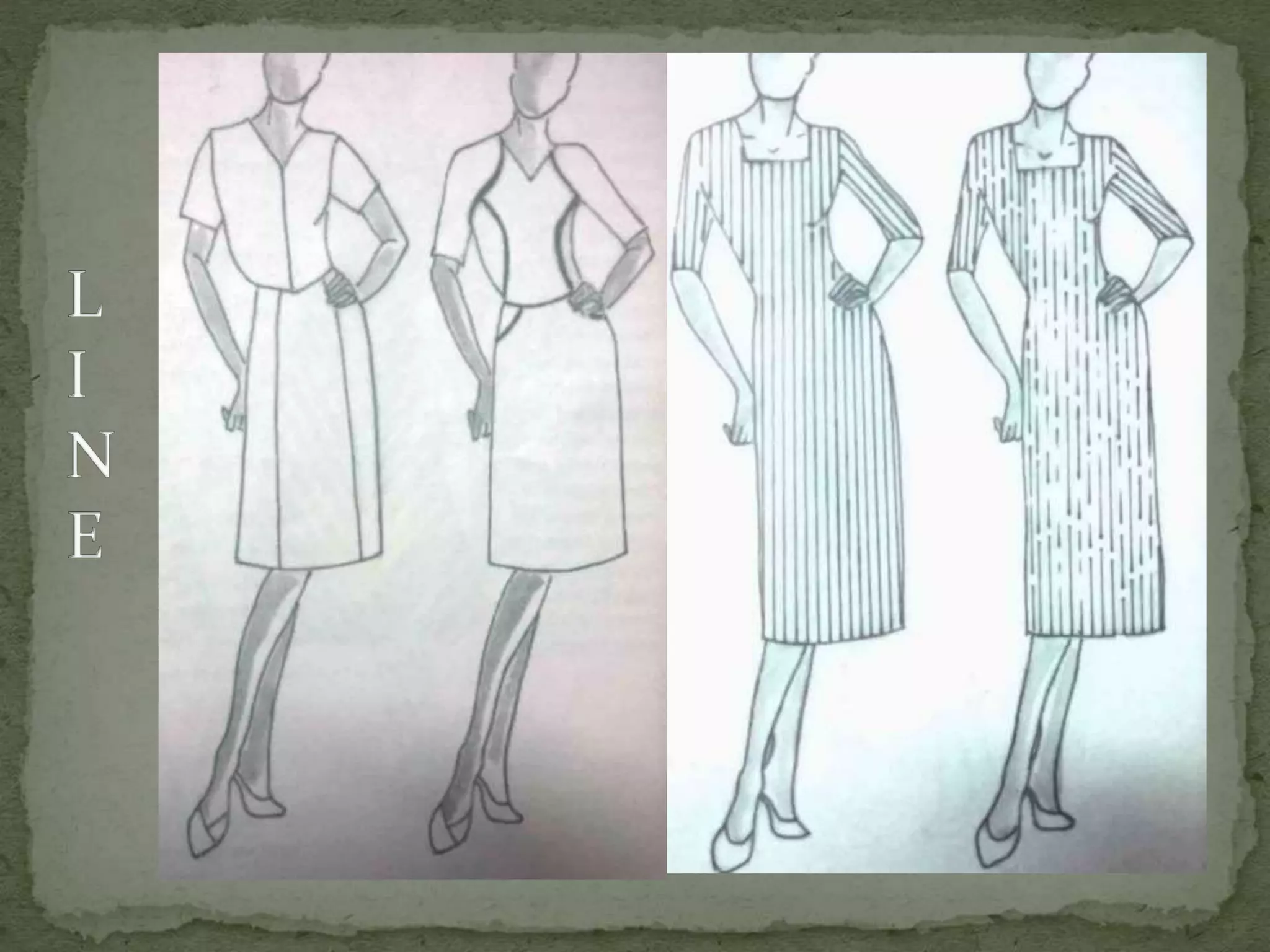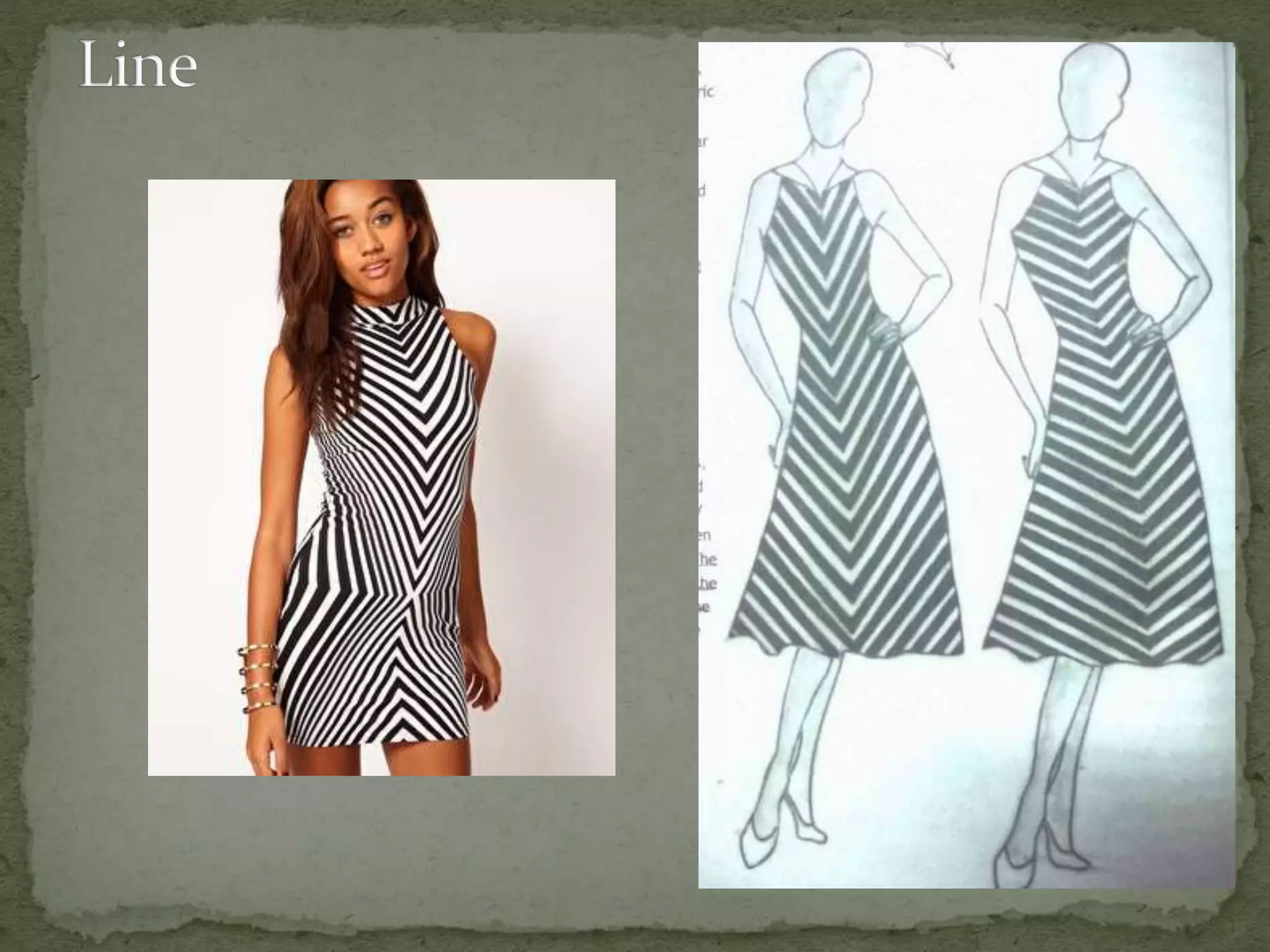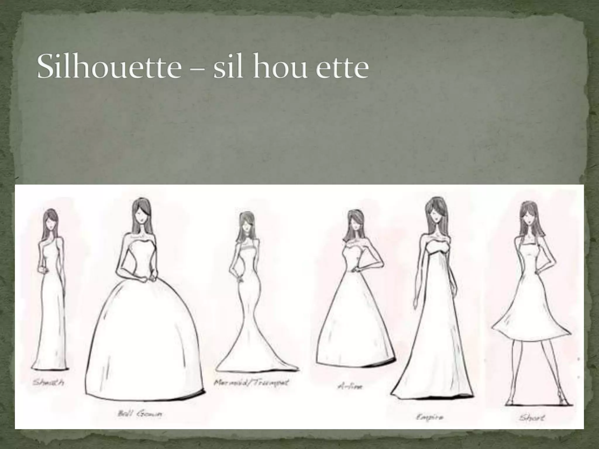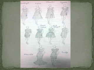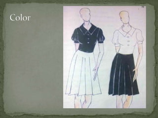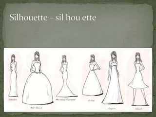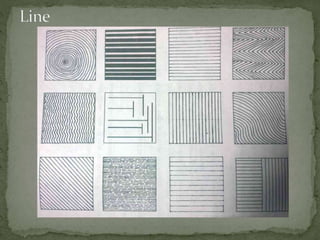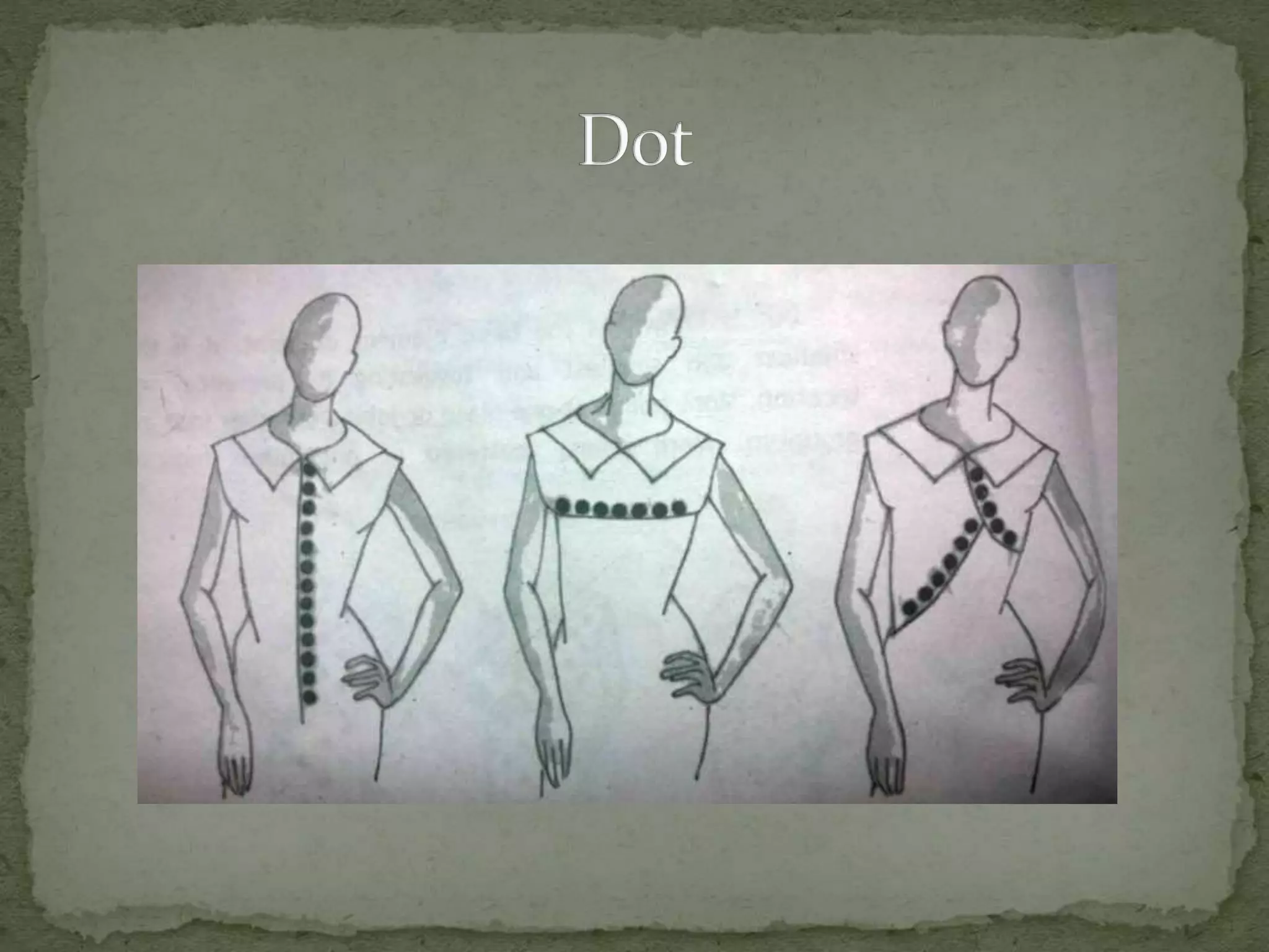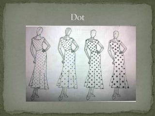 This document discusses the key elements of design that designers use when creating garments, paintings, buildings, or sculptures. It identifies the five main elements as dot, line, shape, color, and texture. Each element is then defined and examples are provided of how they can be used on garments, such as through seams, buttons, embroidery, silhouettes, and different types of prints or fabrics. The document explains that understanding and manipulating these elements enables designers to create various visual effects and works of art.