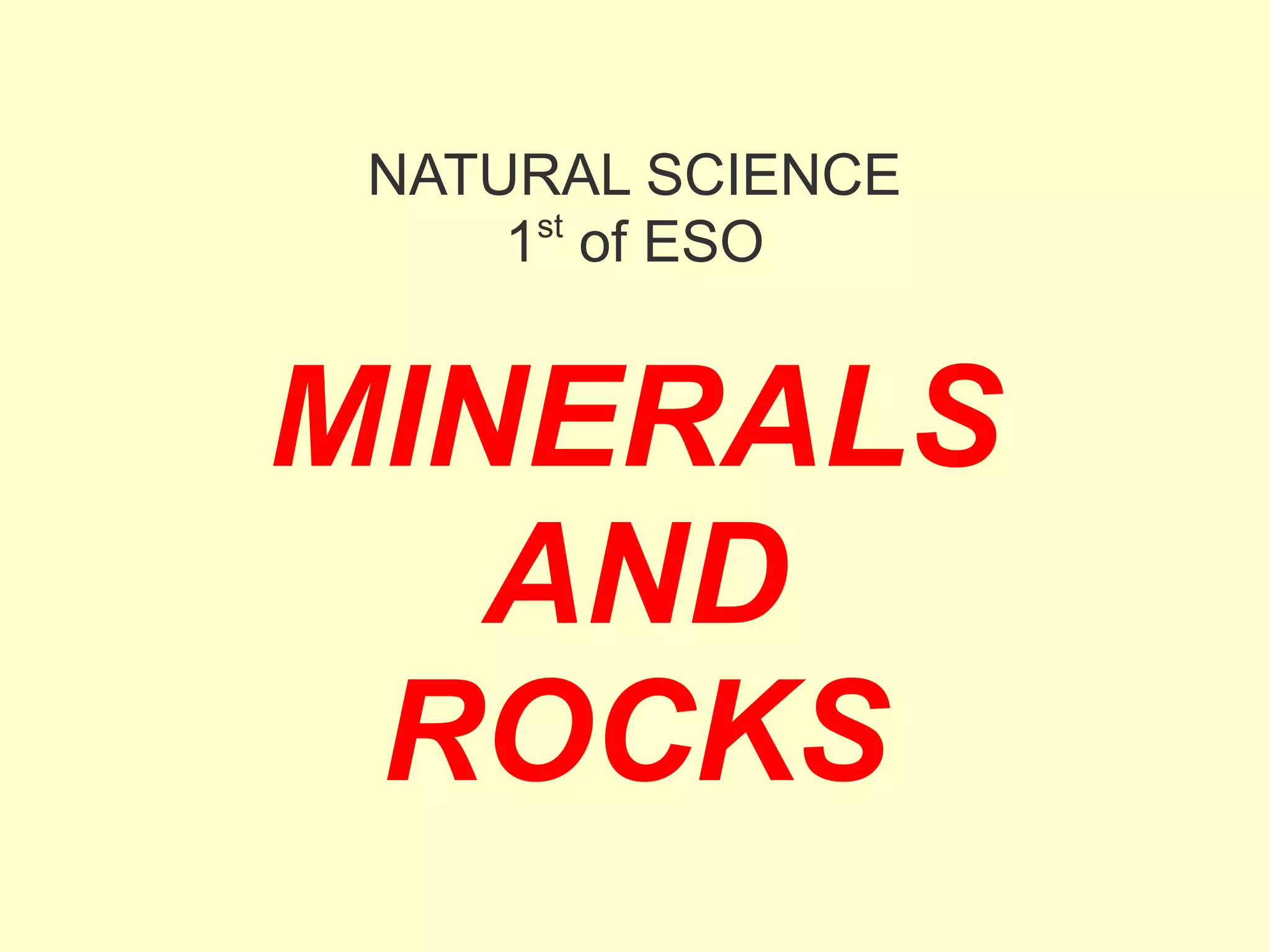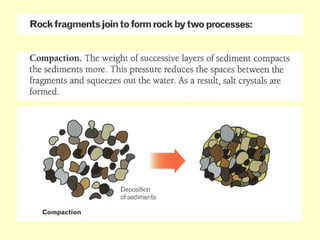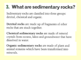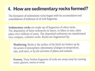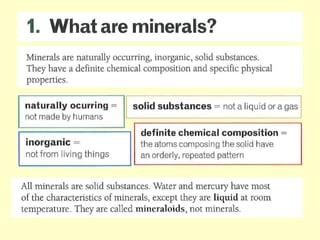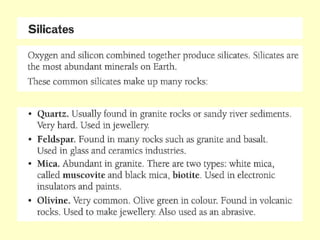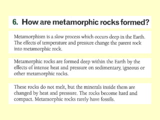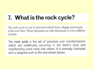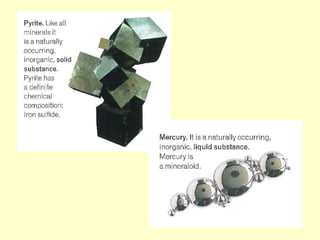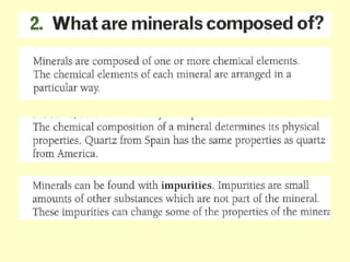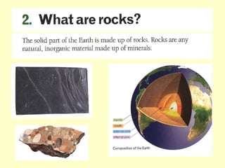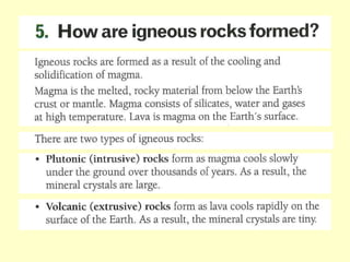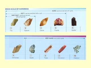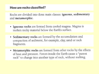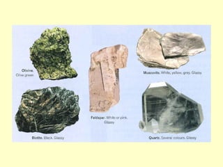 Agate and milky quartz are both types of quartz that have the same chemical composition but differ in appearance due to impurities incorporated during their formation. Minerals can be identified based on properties like color, shape, luster, streak, cleavage, and hardness on the Mohs scale. There are three main types of rocks - igneous rocks which form from solidified magma, either plutonic (cooled below ground) or volcanic (erupted onto the surface), sedimentary rocks which form from the compaction or cementation of sediments, and metamorphic rocks which form from pre-existing rocks undergoing changes due to heat, pressure, and chemical reactions in the Earth's crust.
