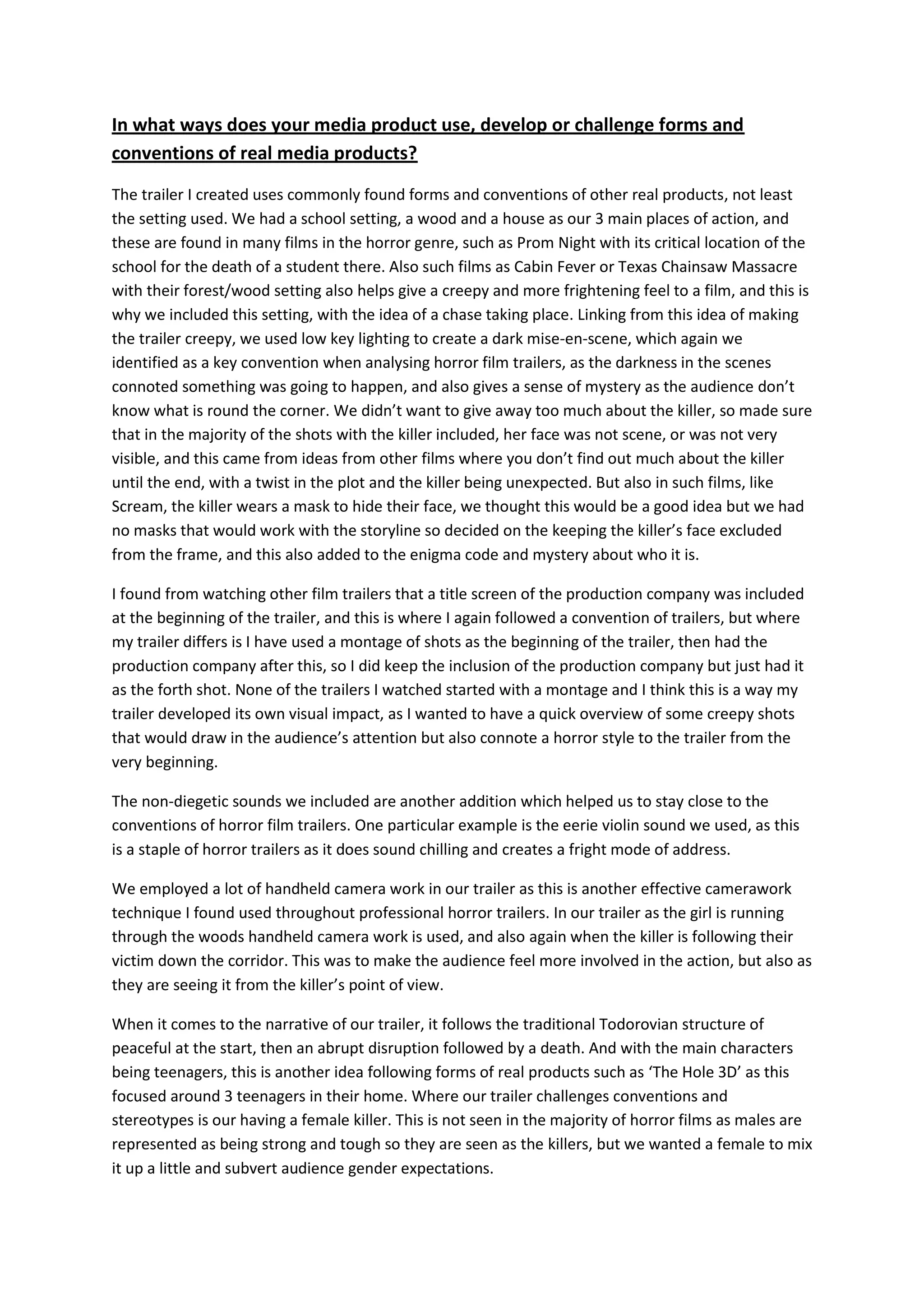 The trailer uses common horror conventions like school and forest settings but challenges expectations by having a female killer. The magazine cover follows conventions like a central image and buzzwords but challenges gender norms with a powerful female image and uses a red tint. The poster features a central character image as expected but challenges conventions by showing her reflection to hint at the plot twist.