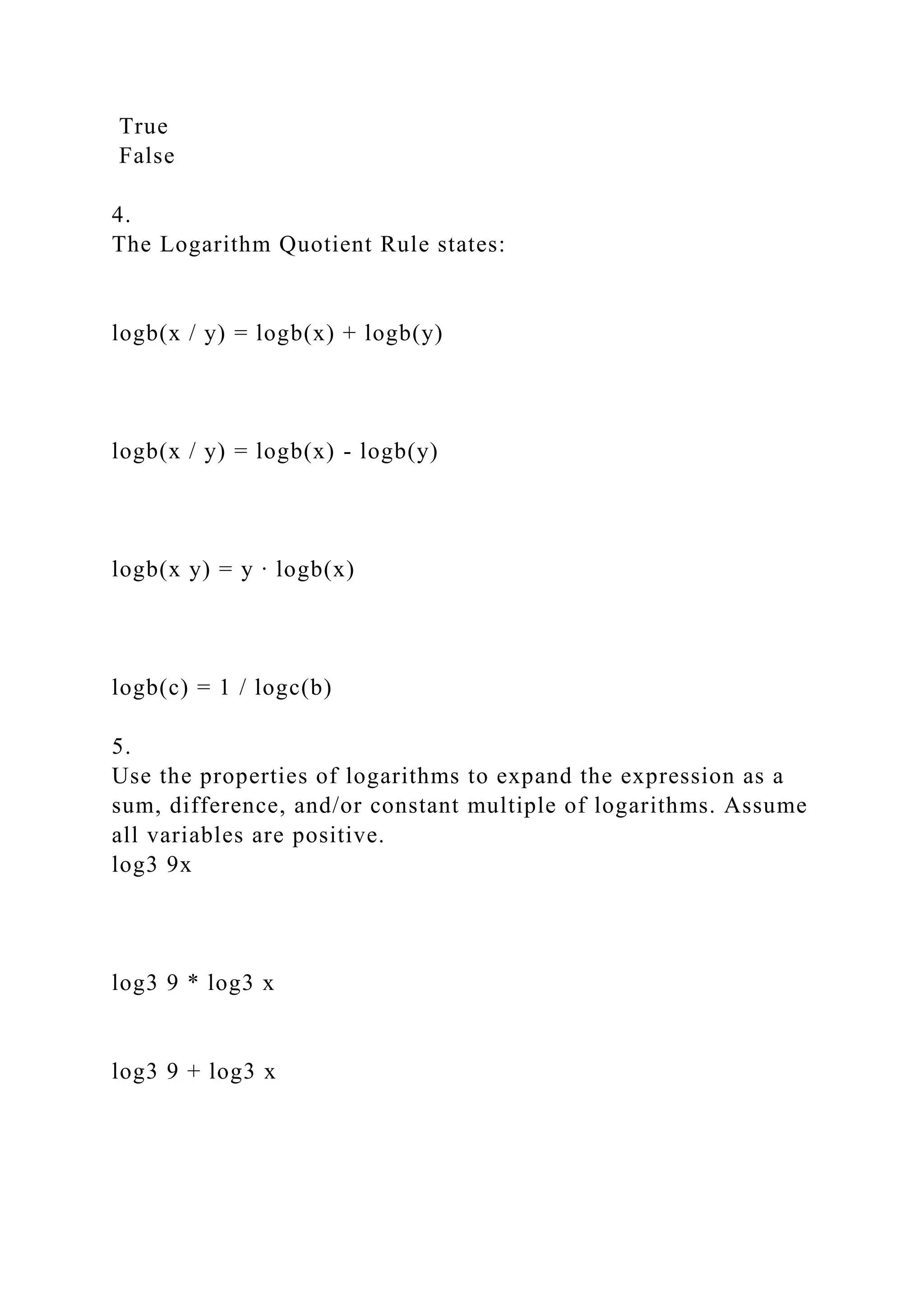 The document contains various mathematical problems and equations covering topics such as logarithms, exponential functions, systems of equations, and applications of these concepts in real-world scenarios. It includes evaluations, transformations between logarithmic and exponential forms, and application of compound interest formulas. Additionally, the document discusses properties of logarithms, graph selections, and systems of equations with practical examples.