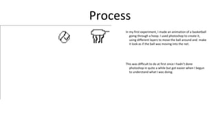 Alfie Ingram created three experiments to inform his final animation project. In the first experiment, he animated a basketball going through a hoop in Photoshop. For the second experiment, he animated two cars chasing each other, with one police car chasing the other. He made it look like the car was leaving tire tracks. In the third experiment, he duplicated the cars from the previous one and had them driving and jumping over a ramp to test out a limitless runner game concept. He plans to use elements from the experiments, like a top-down view and a car game, in his final project.