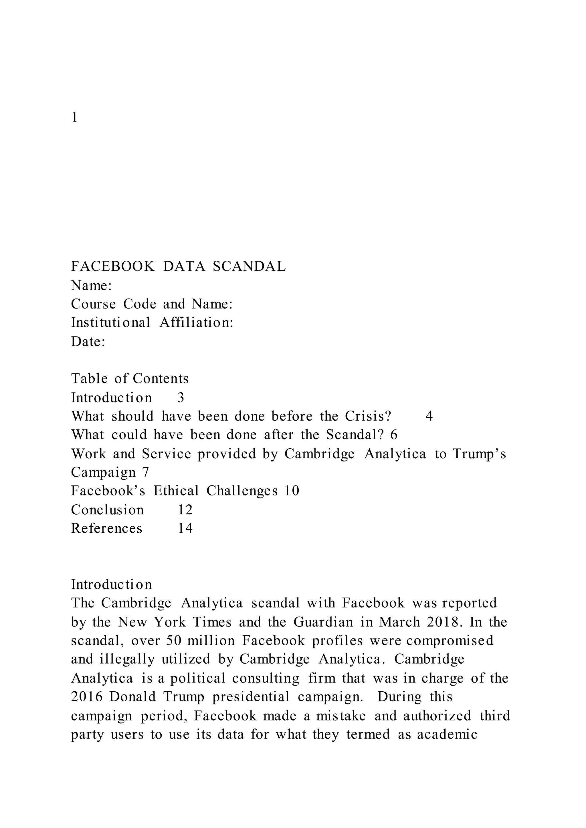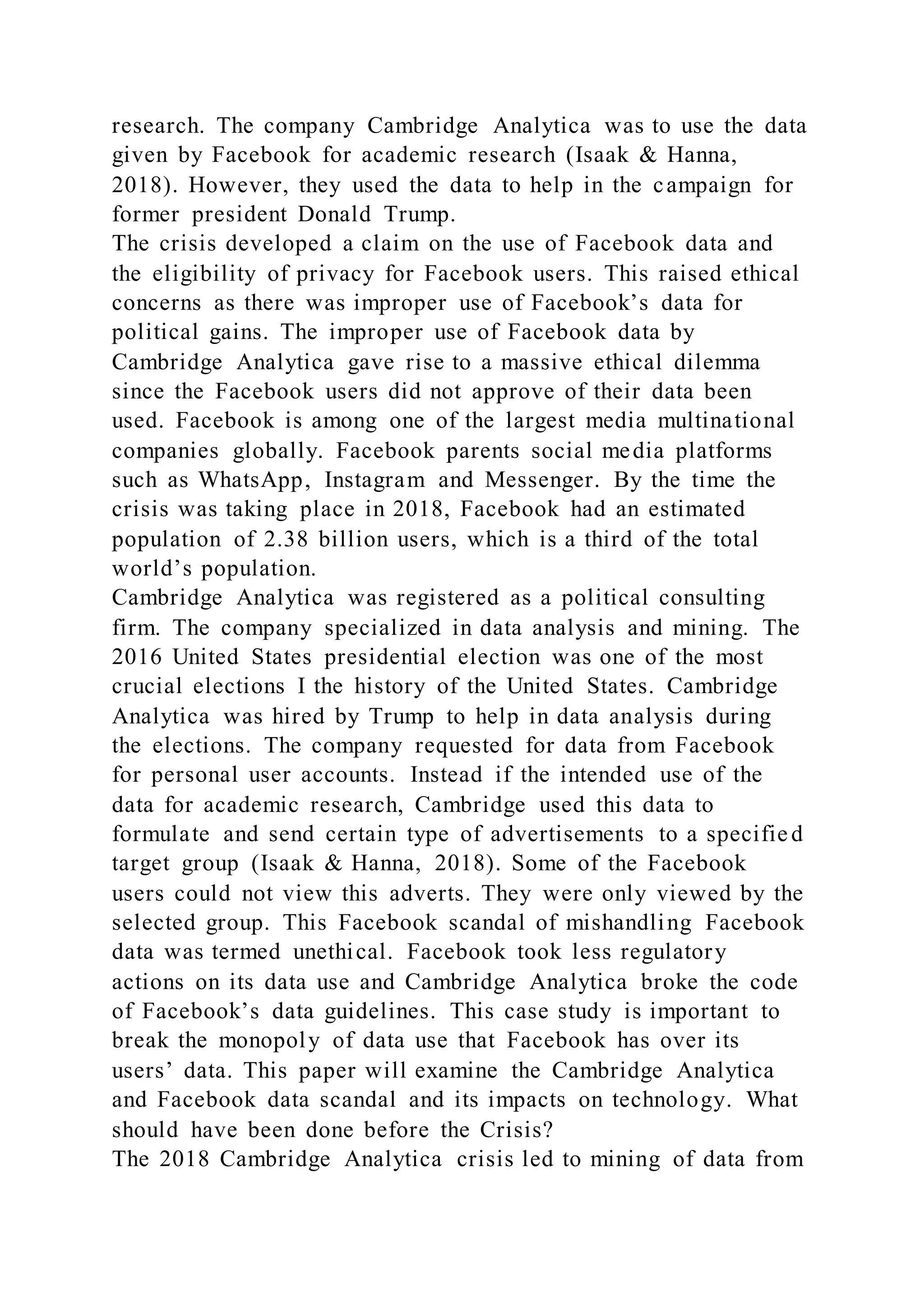 The document discusses the 2018 Facebook data scandal involving Cambridge Analytica. Cambridge Analytica acquired data from 50 million Facebook profiles without consent and used it for political advertising, including for Donald Trump's 2016 presidential campaign. This raised major ethical issues and data privacy concerns. The document examines what Facebook and Cambridge Analytica should have done differently to prevent the crisis and how they could have responded after it occurred.