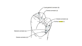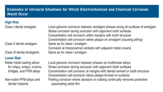 The document discusses the failures associated with silver amalgam as a restorative dental material, citing various causes such as faulty cavity preparation, improper manipulation, and contamination. It outlines different types of failures at visual and microstructural levels, emphasizing the importance of adequate preparation and condensation techniques. Additionally, it highlights the effects of corrosion and tarnish on amalgam restorations, concluding that proper manipulation can lead to successful outcomes.