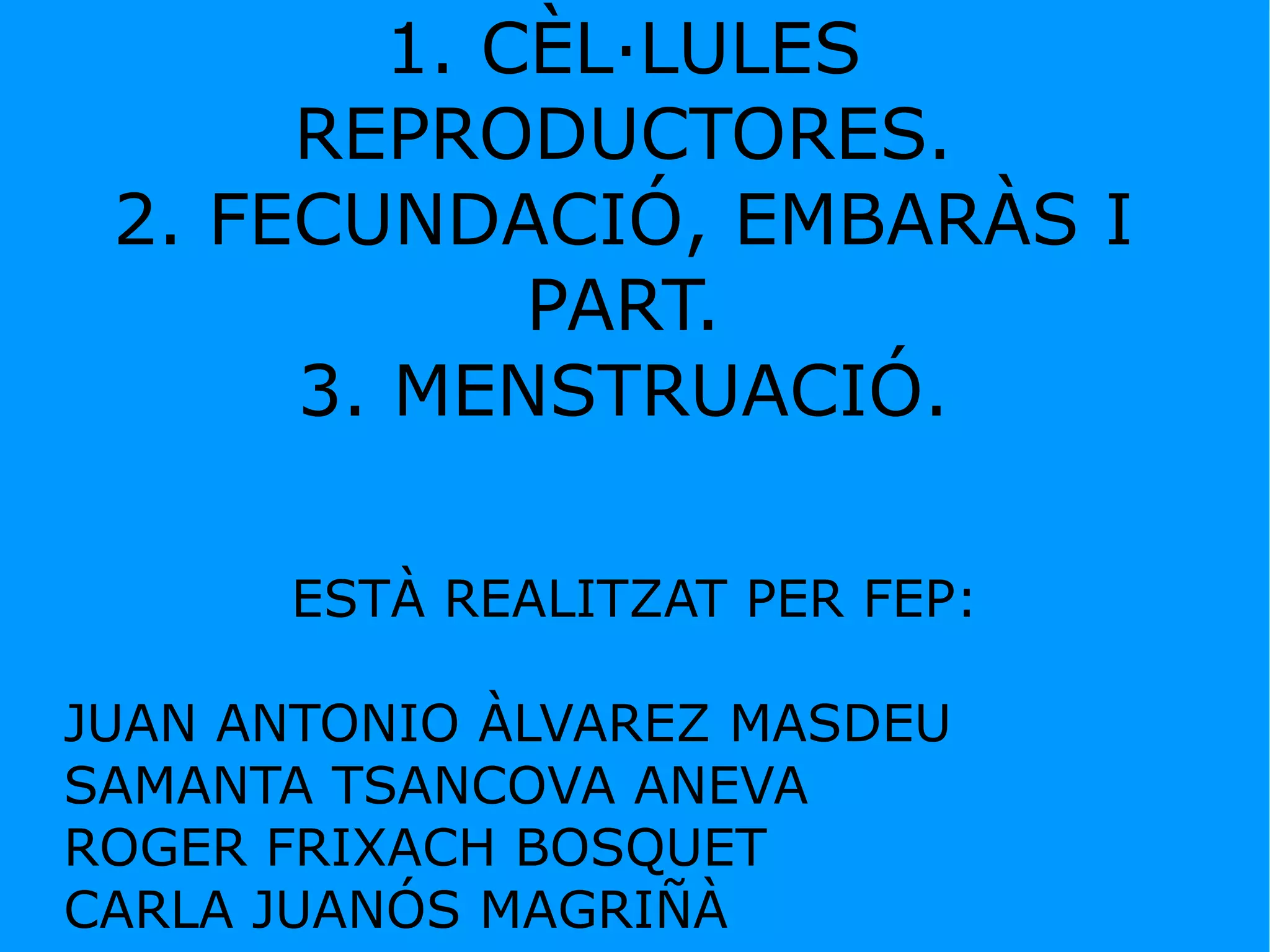 1fep 1. 1. CÈL·LULES REPRODUCTORES. 2. FECUNDACIÓ, EMBARÀS I PART. 3. MENSTRUACIÓ. ESTÀ REALITZAT PER FEP: JUAN ANTONIO ÀLVAREZ MASDEU SAMANTA TSANCOVA ANEVA ROGER FRIXACH BOSQUET CARLA JUANÓS MAGRIÑÀ 2. 3. Té cap , coll i cua que l'ajuda a moure's. 4. 5. 6. 7.