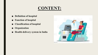 This document provides a summary of key information about hospitals, including their definition, functions, classifications, organization, and the health delivery system in India. It defines a hospital as an organization that takes care of people's health and treats diseases using equipment and trained professionals. Hospitals function to treat patients, prevent diseases, train health professionals, conduct medical research, and support public health. They can be classified based on size, ownership, treatment approach, clinical focus, length of stay, and costs. The document also outlines the organizational structure of hospitals and their departments, as well as India's primary, secondary, and tertiary levels of health care delivery.