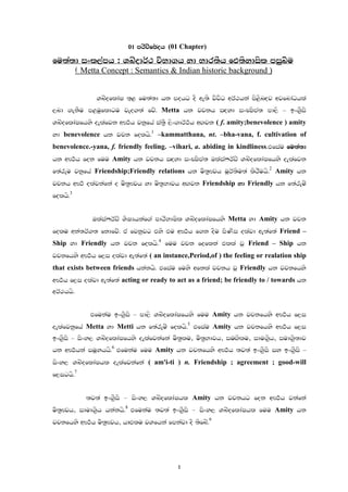 Chapter) fu;a;d ixl,amh : YnzodrA: jsNd.h yd Ndr;Sh ft;sydisl miqnsu ( Metta Concept : Semantics & Indian historic background ) YnzofldaI ;`< fu;a;d hk mohg oS we;s jsjsO wrA:hka ms<snZoj wjfndaOhla ,nd .ekSu m<uqfldgu jeo.;a fjz' Metta hk jpkh iZoyd ixCIsma; md,s – bx.@Sis YnzofldaIfhys oelafjk wF:!h jkqfha ia;@S ,sx.drA:!h wZ.jk ( f. amity;benevolence ) amity yd benevolence hk jpk folhs'1 –kammatthana, nt. –bha-vana, f. cultivation of benevolence.-yana, f. friendly feeling. –vihari, a. abiding in kindliness.tfiau fu;a;d hk wF:!h fok fuu Amity hk jpkh iZoyd ixCIsma; TlaiarAvz YnzofldaIfhys oelafjk f;areu jkqfha Friendship;Friendly relations hk us;@Fjh uQrA;su;a lsrSuhs'2 Amity hk jpkh wF:! olajkafka o us;@Fjh yd us;@Ndjh wZ.jk Friendship yd Friendly hk f;areuz folhs'3 TlaiarAvz YsIHhkaf.a mdrsNdIsl YnzofldaIfhys Metta yd Amity hk jpk folu wka;rA.; fkdfjz' ta fjkqjg tys tu wF:!h f.k oSu msKsi olajd we;af;a Friend – Ship yd Friendly hk jpk folhs'4 fuu jpk foflka tlla jQ Friend – Ship hk jpkfhys wF:!h f,i olajd we;af;a ( an instance,Period,of ) the feeling or realation ship that exists between friends hkakhs' tfiau fuys wfkla jpkh jQ Friendly hk jpkfhys wF:!h f,i olajd we;af;a acting or ready to act as a friend; be friendly to / towards hk wrA:hhs' tfukau bx.@Sis – md,s YnzofldaIfhys fuu Amity hk jpkfhys wF:!h f,i oelafjkqfha Metta yd Metti hk f;areuz folhs'5 tfiau Amity hk jpkfhys wF:!h f,i bx.@Sis – isxy, YnzofldaIfhys oelafjkafka us;@lu" us;@Ndjh" iuZ.slu" idu.@sh" iud.@s;dj hk wF:!hka iuQyhhs'6 tfukau fuu Amity hk jpkfhys wF:!h ;j;a bx.@Sis iy bx.@Sis – isxy, YnzofldaIhl oelafjkafka ( am'i-ti ) n. Friendship ; agreement ; good-will f,ighs'7 ;j;a bx.@Sis - isxy, YnzofldaIhl Amity hk jpkhg fok wF:!h jkafka us;@Fjh" idud.@sh hkakhs'8 tfukau ;j;a bx.@Sis - isxy, YnzofldaIhl fuu Amity hk jpkfhys wF:!h us;@Fjh" hdZMlu jYfhka fmkajd oS ;sfnz'9 1