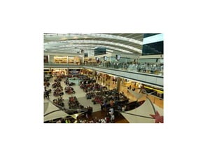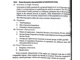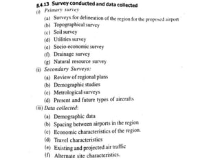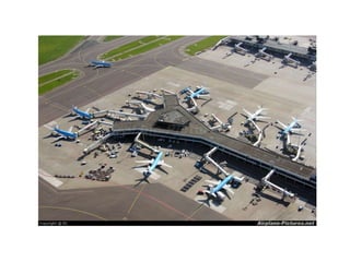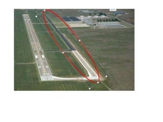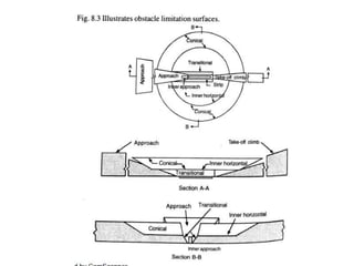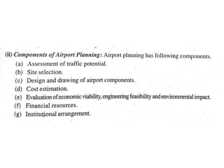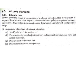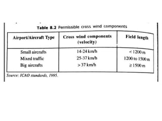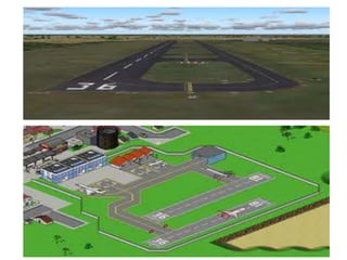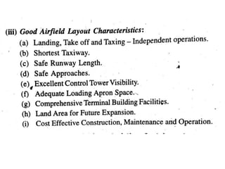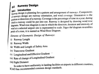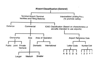 This document provides information on airport engineering and airport layout. It discusses how airport engineers design and construct terminals, runways, and navigation aids. Key components of an airport layout include runways for takeoffs and landings, terminal buildings, aircraft parking aprons, taxiways to move aircraft to/from runways, aircraft stands for parking, hangars for aircraft maintenance, and a control tower for air traffic control. Factors like aircraft characteristics, wind patterns, and future demand must be considered in airport planning and design.