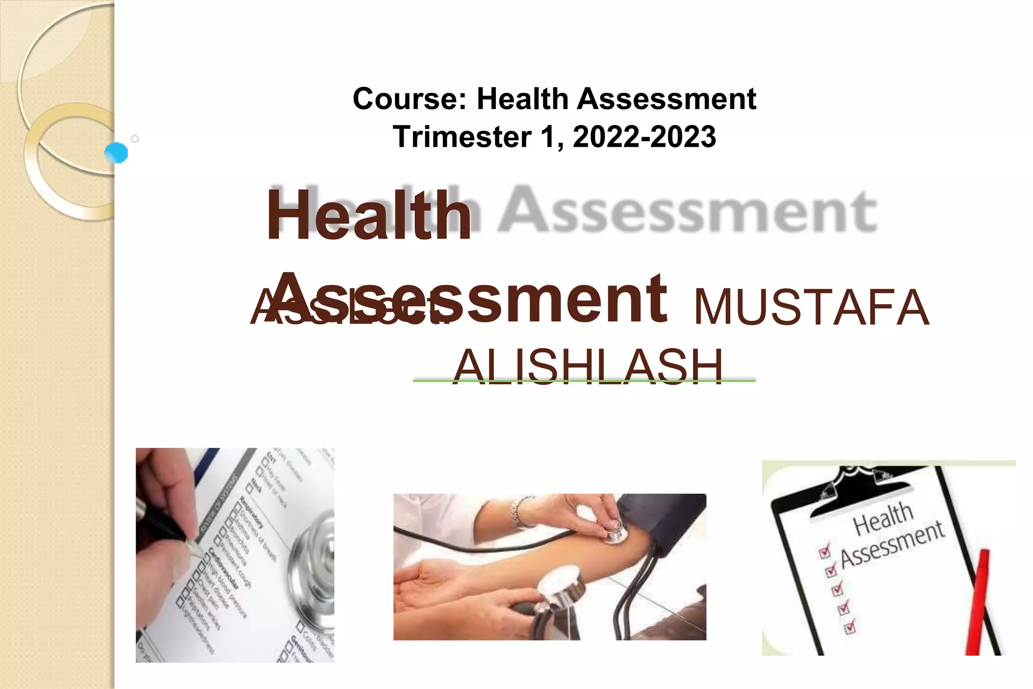 This document provides an overview of health assessment for nursing students. It discusses the objectives of health assessment, which include surveillance of health status, periodic assessment, and increasing client participation in health care. It also covers the nursing process, which is used to organize health assessment data. The major steps of health assessment are described as collecting subjective and objective data through patient interviews and physical examinations. Specific techniques for interviews, such as using open-ended questions, are outlined. The document also lists the components of a complete health history.