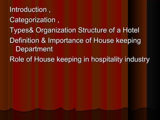 Housekeeping is defined as providing a clean, comfortable and safe environment, especially in hotels and other institutions. It aims to maintain cleanliness, comfort and safety. The housekeeping department is responsible for cleaning and maintaining guest rooms, public areas, floors, offices and other back areas. It works closely with other departments like front office, engineering and food and beverage. The head of the housekeeping department is the executive housekeeper. Staff includes room attendants, supervisors, housemen, laundry workers and others. The department is also responsible for pest control, decorations, landscaping and outsourced maintenance jobs. Housekeeping services are now common in various establishments beyond hotels.