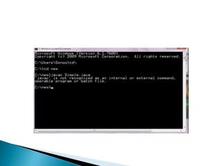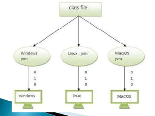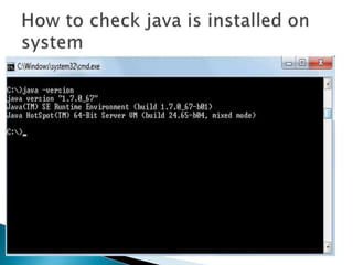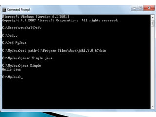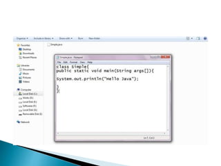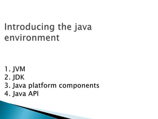 This document provides an overview of the Java programming language and environment. It discusses that Java is both a programming language and platform, and describes some of Java's key characteristics like being object-oriented, platform independent, secure, robust and high performance. It also outlines the different types of applications that can be created in Java, such as standalone, web, enterprise and mobile applications. The document concludes by explaining the basic steps to compile and run a simple Java program, and some modifications that can be made to the main method.