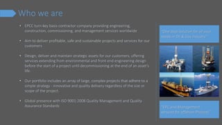 KMAC is an engineering, procurement, construction, and management services company providing turn-key solutions for oil and gas projects worldwide. They have a global presence and offer a full range of services from front-end engineering to decommissioning. KMAC's services include engineering, construction, commissioning, consultancy, and project management. They have a strong track record of successfully delivering complex projects on schedule and within budget.