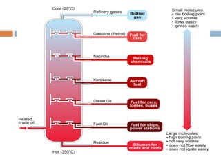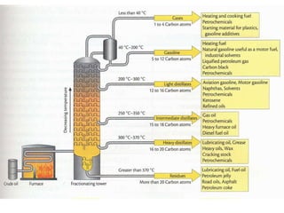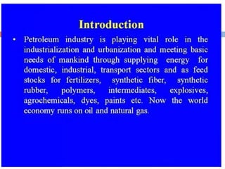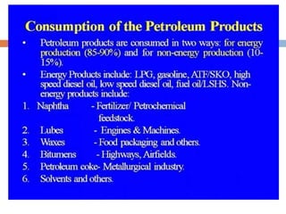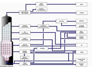 Petroleum refineries process crude oil through separation and conversion steps to produce useful petroleum products. Crude oil is distilled and separated into fractions like gasoline, diesel, and residual fuel oil. Pakistan has several large petroleum refineries that process over 100,000 barrels of crude oil per day into fuels, lubricants, and feedstocks for the chemical industry. Refineries operate complex systems to continuously process crude oil into products through distillation, cracking, reforming, and other processes.