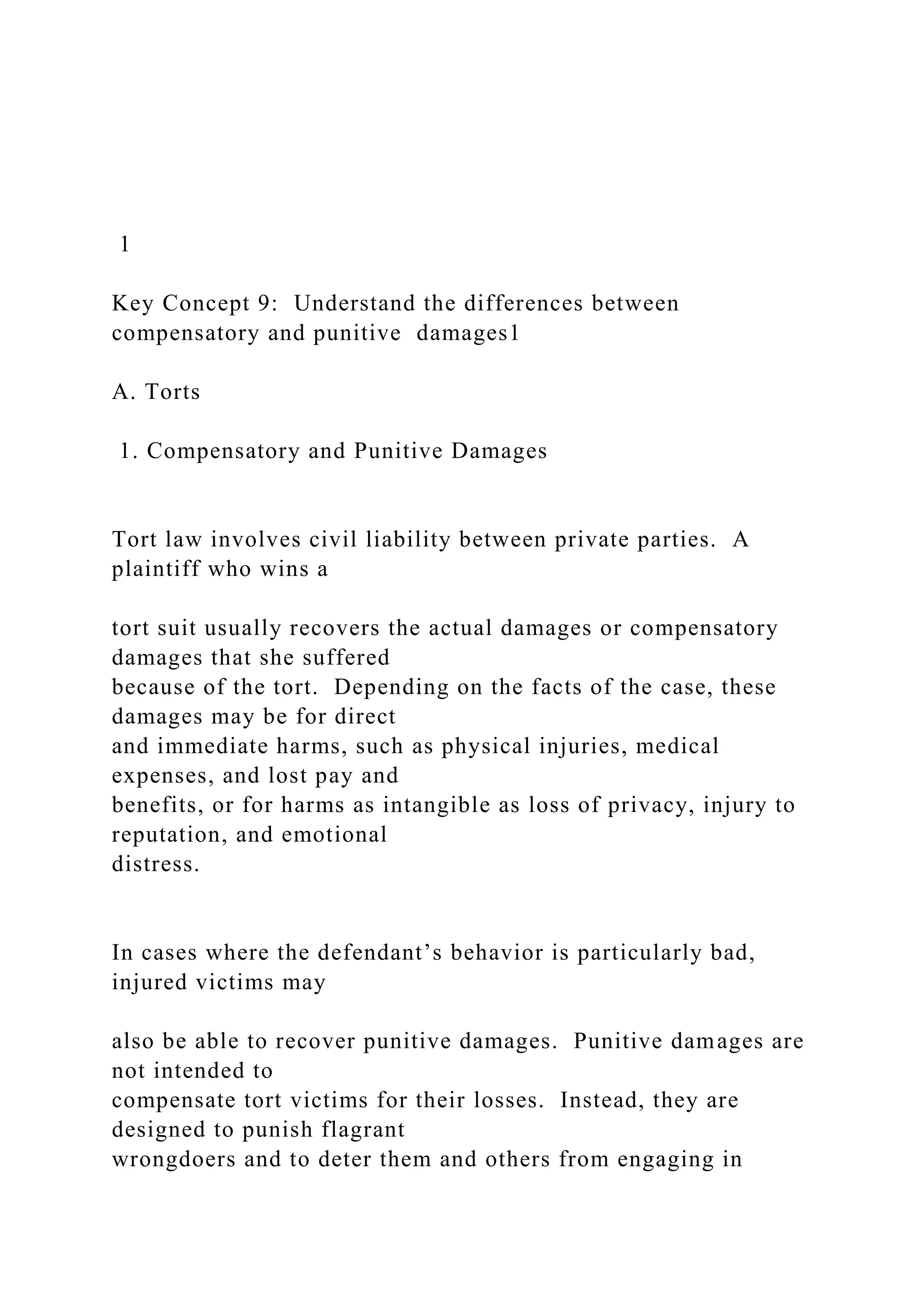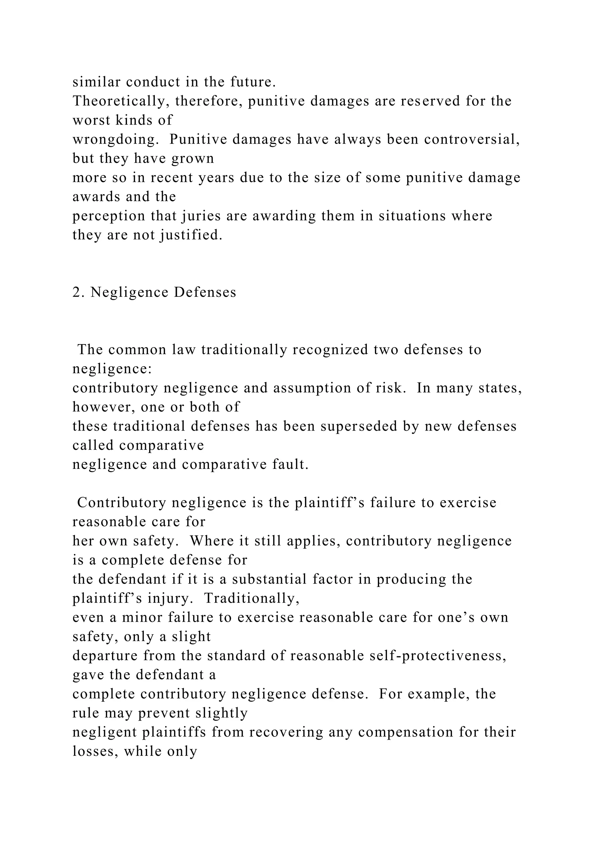 The document discusses key concepts in tort and contract law, focusing on the differences between compensatory and punitive damages, as well as defenses to negligence and breach of contract. It explains compensatory damages as compensation for actual losses, while punitive damages aim to punish wrongful behavior, particularly in tort cases. Additionally, it addresses the evolution of negligence defenses, including contributory negligence and comparative negligence, and the importance of contract remedies to protect the interests of the injured party.
