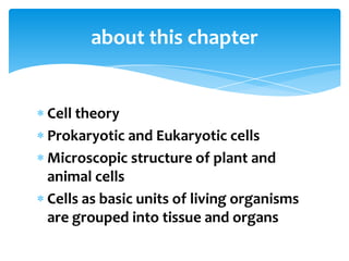 1. The document discusses the structure and function of cells, tissues, and organs in plant and animal systems.