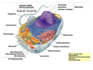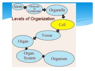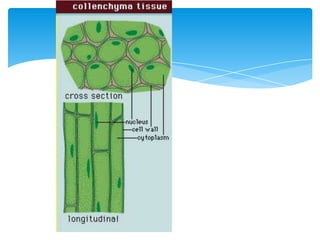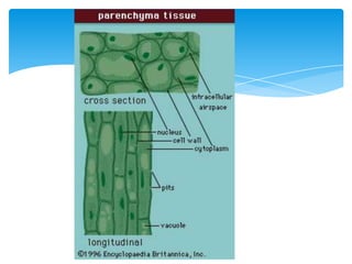 2. In plants, cells are organized into tissues including ground tissue, vascular tissue, and dermal tissue. Meristematic tissues allow growth and differentiation of primary tissues.