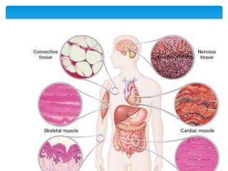 3. In animals, the main tissue types are epithelial, muscle, nervous and connective tissues. Organs consist of multiple tissue types organized to perform functions, and organ systems interact to maintain homeostasis.