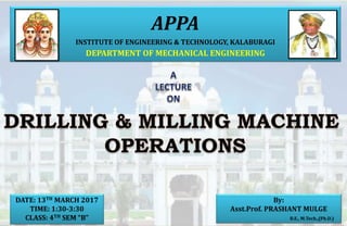 2. Milling operations such as plain milling, face milling, angular milling, form milling, straddle milling, gang milling, slot and groove milling, keyway milling, slitting, end milling, profile milling, gear milling, and thread milling. Definitions and purposes are given for each operation.