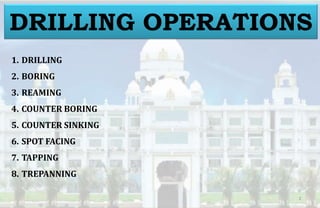 This document provides an overview of various machining operations presented in a classroom lecture, including: