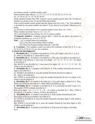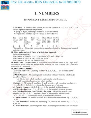 This document provides information on various types of numbers and formulas related to numbers. It discusses natural numbers, whole numbers, integers, even/odd numbers, prime numbers and tests for divisibility. It also covers topics like place value, numeral systems, arithmetic progressions, geometric progressions, and shortcut methods for multiplication. Key points include the definition of different types of numbers, tests for divisibility by various numbers, formulas for operations like addition, subtraction and multiplication of algebraic expressions, and the general forms of arithmetic and geometric progressions.