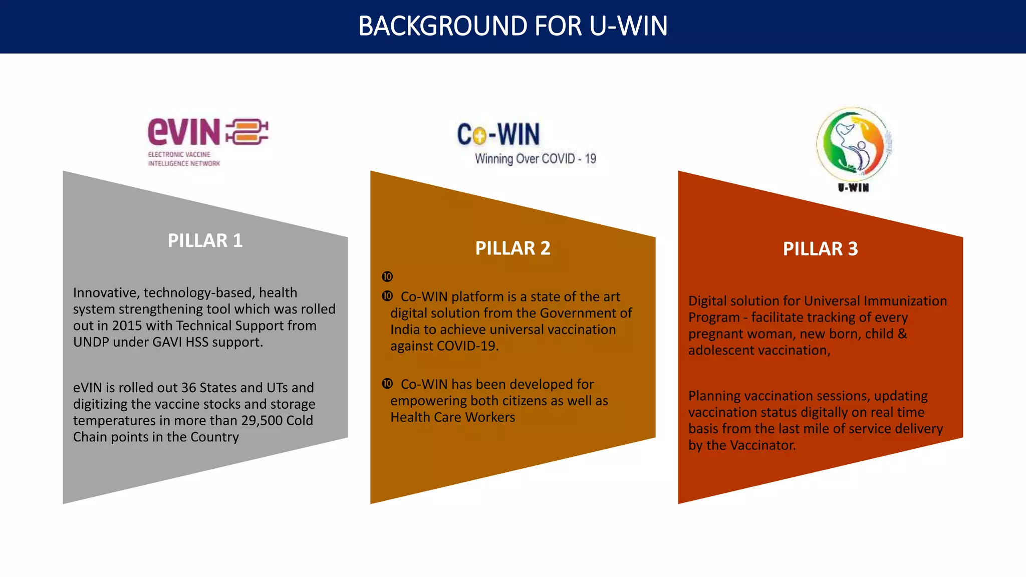 U-WIN is a digital solution for India's Universal Immunization Program that aims to facilitate tracking of vaccinations for pregnant women, newborns, children and adolescents. It consists of several modules: