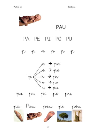 This document appears to be a series of pages from a children's workbook about learning letters and sounds in Spanish. Over the course of 15 pages, it introduces the letters P, A, E, I, O, U and has the child write out words using those letters. It also has exercises where the child rearranges or completes words. The goal seems to be helping young learners practice early reading and spelling skills in Spanish.