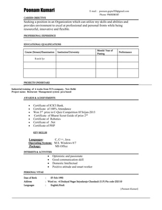This document is a resume for Poonam Kumari providing her contact information, career objective, educational qualifications, projects undertaken, awards, skills, interests and personal details. Poonam holds a B.tech degree and completed a 6-week industrial training at TCS developing a restaurant management system using Java. She has received several certificates and awards and lists proficiencies in languages like C, C++ and Java as well as Microsoft Office and Windows operating systems.