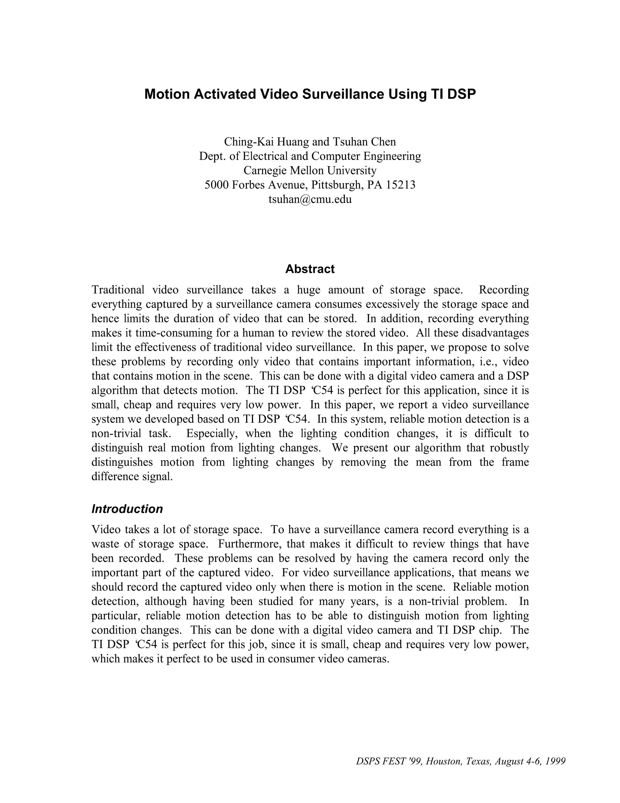 1) The document proposes a motion-activated video surveillance system using a TI DSP chip that only records video when motion is detected in order to save storage space.