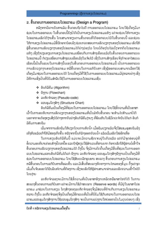 ີເປນັອຸປະກອນທາງອີເລກັໂຕນກິສຢ໌່າງໜ່ງຶ ເຊ່ີງບ່ໍສາມາດເຮດັວຽກດວ້ຍຕນົເອງໄດ ້ ບົດທີ່ 1 ຫລັກການຂຽນໂປຣແກຣມເບື້ອງຕົ້ນ ບດົທ່ ີ1 ຫລັກການຂຽນໂປຣແກຣມເບື້ອງຕົ້ນ 1 ແຕ່ຈະສາມາດເຮັດວຽກໄດ້ຕາມຊຸດຄໍາສັ່ງໃນໂປຣແກຣມທີ່ປ້ອນເຂົ້າ ສູ່ເຄ່ອືງ ເຊ່ີງຈະເຮດັວຽກຕາມຄໍາສ່ງັ ເທ່ອືລະຄໍາສ່ງັ (Step by Step) ໂດຍຄໍາສ່ງັທ່ເີຄ່ອືງຄອມພວິເຕສີາມາດເຂາົ້ໃຈໄດ ້ຈະຕອ້ງຢູ່ໃນຮູບແບບ ຂອງພາສາເຄ່ອືງ (Machine Language) ແຕ່ຖາ້ມກີານຂຽນດວ້ຍພາສາອ່ນືທ່ບີ່ໍແມ່ນພາສາເຄ່ອືງ ຫລທື່ີ ເອີ້ນ ວ່ າ ພາສາຊັ້ນ ສູງ (High-level Language) ກໍຈະຕອ້ງມີຕົວແປພາສາ ເຊ່ັນ ຄອມໄພເລີລ ໌ (Compiler) ຫລ ືອນິເຕລີພ໌ເີຕລີ ໌(Interpreter) ກ່ໍການແປພາສາຊນັ້ສູງນນັ້ໃຫເ້ປນັພາສາເຄ່ອືງອີກເທ່ອື ໜ່ງຶໃນການຂຽນໂປຣແກຣມຫລພືາສາຄອມພວິເຕນີ ີ້ໂດຍທ່ວົໄປແລວ້ແຕ່ລະພາສາຈະມຫີລກັເກນໃນການ ຂຽນແລະການອອກແບບໂປຣແກຣມຄືກັນ ເຊີ່ງສາມາດທີ່ຈະແບ່ງຂັ້ນ ຕອນການຂຽນໂປຣແກຣມອອກໄດ້ ເປນັ 7 ຂນັ້ຕອນ ດ່ງັນ ີ້ 1. ຂັ້ນຕອນການວເິຄາະບນັຫາ (Analysis the Problem) 2. ຂັ້ນຕອນການອອກແບບໂປຣແກຣມ (Design a Program) 3. ຂັ້ນຕອນການຂຽນໂປຣແກຣມ (Coding) 4. ຂັ້ນຕອນການກວດສອບຂໍ້ຜ ດິພາດຂອງໂປຣແກຣມ (Testing and Debugging) 5. ຂັ້ນຕອນການທດົສອບຄວາມຖກືຕອ້ງຂອງໂປຣແກຣມ (Testing and Validating) 6. ຂັ້ນຕອນການເຮດັເອກະສານປະກອບໂປຣແກຣມ (Documentation) 7. ຂັ້ນຕອນການບໍາລຸງປ່ນິປວົໂປຣແກຣມ (Program Maintenance) 1. ຂັ້ນຕອນການວເິຄາະບນັຫາ (Analysis the problem) ຂັ້ນ ຕອນນີ້ເ ປັນຂັ້ນ ຕອນທໍາອິດທ່ີນກັຂຽນໂປຣແກຣມຈະຕອ້ງເຮດັກ່ອນທ່ີຈະລົງມຂືຽນໂປຣ ແກຣມແທ້ໆ ເພື່ອເຮັດຄວາມເຂົ້າໃຈກັບບັນຫາທີ່ເກິດຂື້ນ ແລະຄົ້ນຫາຈຸດມຸ້ງໝາຍຫລືສິ່ງທີ່ຕ້ອງການ ໃນຂັ້ນ ຕອນນຈີ້ະມອີງົຄປ໌ະກອບຢູ່ 3 ອງົຄປ໌ະກອບທ່ຈີະຊ່ວຍໃນການວເິຄາະບນັຫາ ໄດແ້ກ່ 1. ການລະບຸຂໍມູ້ນເຂາົ້ (Input) ຕອ້ງຮູວ້່າມຂີໍມູ້ນຫຍງັແດ່ທ່ຈີະຕອ້ງປອ້ນເຂາົ້ສູ່ຄອມພວິເຕີພອ້ມ ກບັໂປຣແກຣມ ເພ່ອືໃຫໂ້ປຣແກຣມເຮດັການປະມວນຜນົແລະອອກຜນົລບັ 2. ການລະບຸຂໍມູ້ນອອກ (Output) ຈະພຈິາລະນາວ່າວຽກທ່ເີຮດັມເີປາົ້ໝາຍຫລວືດັຖຸປະສງົຫຍງັ ຕອ້ງການຜນົລບັທທ໌່ມີີຮູບຮ່າງໜາ້ຕາເປັນແນວໃດ ໂດຍຈະຕອ້ງຄໍານງຶເຖງິຜູໃ້ຊເ້ປັນຫລກັໃນການອອກ ແບບຜນົລບັ 3. ກໍານດົວທິກີານປະມວນຜນົ (Process) ຕອ້ງຮູວ້ທິກີານປະມວນຜນົເພ່ອືໃຫໄ້ດຜ້ນົລບັຕາມ ທ່ຕີອ້ງການ