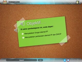 Dokumen ini menerangkan tentang rangkaian protokol, termasuk fungsi TCP/IP dalam pengiriman data melalui Internet dan bagaimana alamat IP berfungsi sebagai identiti bagi peranti dalam jaringan. Ia juga membincangkan mengenai perbezaan antara alamat IP statik dan dinamik, serta konsep DHCP yang mengurus pemberian alamat IP secara automatik. Penjelasan diakhiri dengan contoh format alamat IP dan nama domain sebagai pengganti yang lebih mudah diingat.