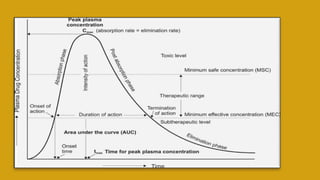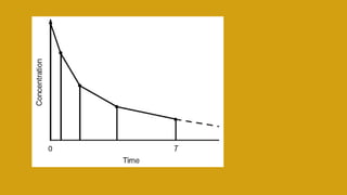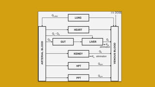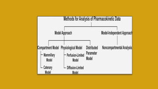 This document discusses pharmacokinetics and provides details about various pharmacokinetic parameters and models. It begins by defining pharmacokinetics as the study of the kinetics of drug absorption, distribution, metabolism and excretion. It then describes parameters that can be evaluated from plasma drug concentration-time profiles, including Cmax, Tmax, and AUC. Next, it discusses compartment models and physiological models that are used to analyze pharmacokinetic data and predict drug disposition. It concludes by covering the model-independent approach of noncompartmental analysis.