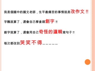 這篇文檔記錄了一位國文老師在改學生作文過程中的幽默與無奈。老師面對學生在作文中出現的各種奇怪語言與邏輯感到哭笑不得,並對學生的創意和表達感到驚訝同時無法理解。文章透過學生的例子展示了教育的挑戰與樂趣。