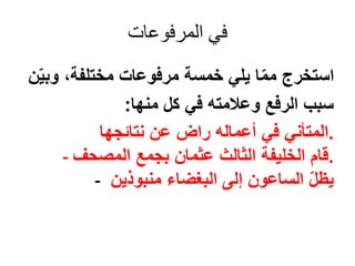 يتناول الوثيقة قواعد اللغة العربية وأسئلة عن المرفوعات والمنصوبات والمجرورات، متضمنًا أمثلة متعددة من اللغة. كما يتطلب من الطالب استخراج علامات الرفع والنصب من الجمل المقدمة. الوثيقة شاملة لمواضيع متعددة تتعلق باللغة العربية وتطبيقاتها.