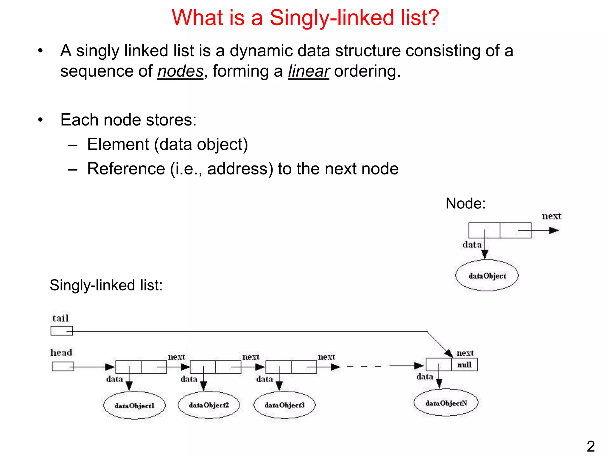 Singly linked lists allow for efficient insertion and deletion of elements without shifting other elements. They have dynamic size and use less memory than arrays if the list is sparsely populated. However, random access is not efficient as elements are not stored contiguously in memory. Common operations like search, insertion, and deletion have O(n) time complexity due to the need to traverse the list sequentially. Space complexity is O(n) to store the elements and references between nodes.