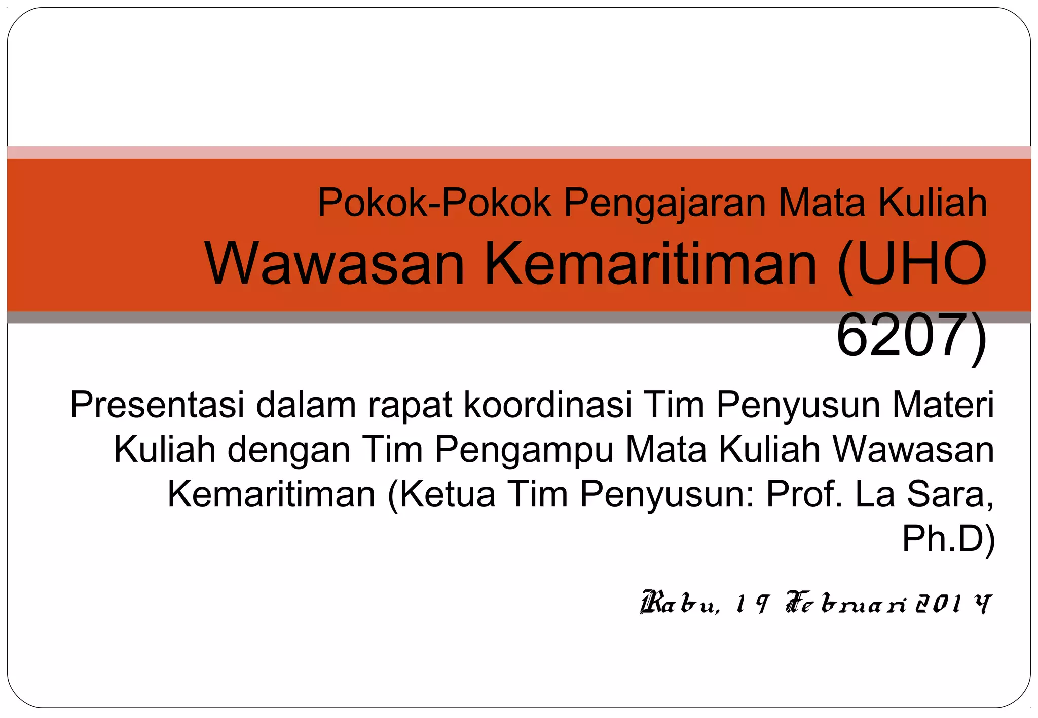 Mata kuliah Wawasan Kemaritiman membahas berbagai topik terkait kemaritiman Indonesia, meliputi definisi dan sejarah kemaritiman, aspek sosial budaya dan ekonomi maritim, zona ekonomi eksklusif, lingkungan maritim, ilmu dan teknologi maritim, potensi dan mitigasi bencana laut, pelayaran dan perikanan, pertahanan dan keamanan maritim, serta konsep negara maritim. Mata kuliah ini bertujuan memberikan pemah
