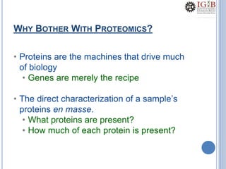 Proteomics uses mass spectrometry to characterize proteins in a biological sample on a large scale. It provides information about which proteins are present, how much of each protein exists, and how proteins are modified. Mass spectrometry coupled with protein separation techniques and database searching represents a major advancement for protein analysis, allowing characterization of entire proteomes. Key aspects of proteomics include separating proteins, ionizing peptides using techniques like MALDI and ESI, and identifying proteins by matching mass spectra to in silico digests or sequencing peptides de novo. While sample preparation and computational methods are still developing, proteomics offers insights beyond what is possible with genomics alone.