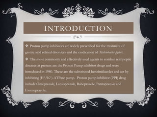 1) Proton pump inhibitors like omeprazole, lansoprazole, pantoprazole, rabeprazole, and esomeprazole are widely used to treat gastric acid-related disorders by inhibiting the H+/K+ ATPase pump in parietal cells.