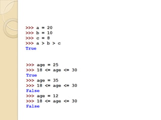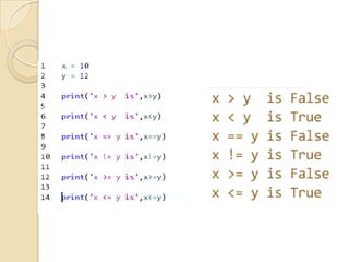 This document provides an introduction to the Python programming language. It discusses Python's design philosophy emphasizing readability. It also covers printing messages, reading input, variables and data types, operators, and basic syntax like comments and identifiers. Arithmetic, relational, logical and bitwise operators are explained along with examples.