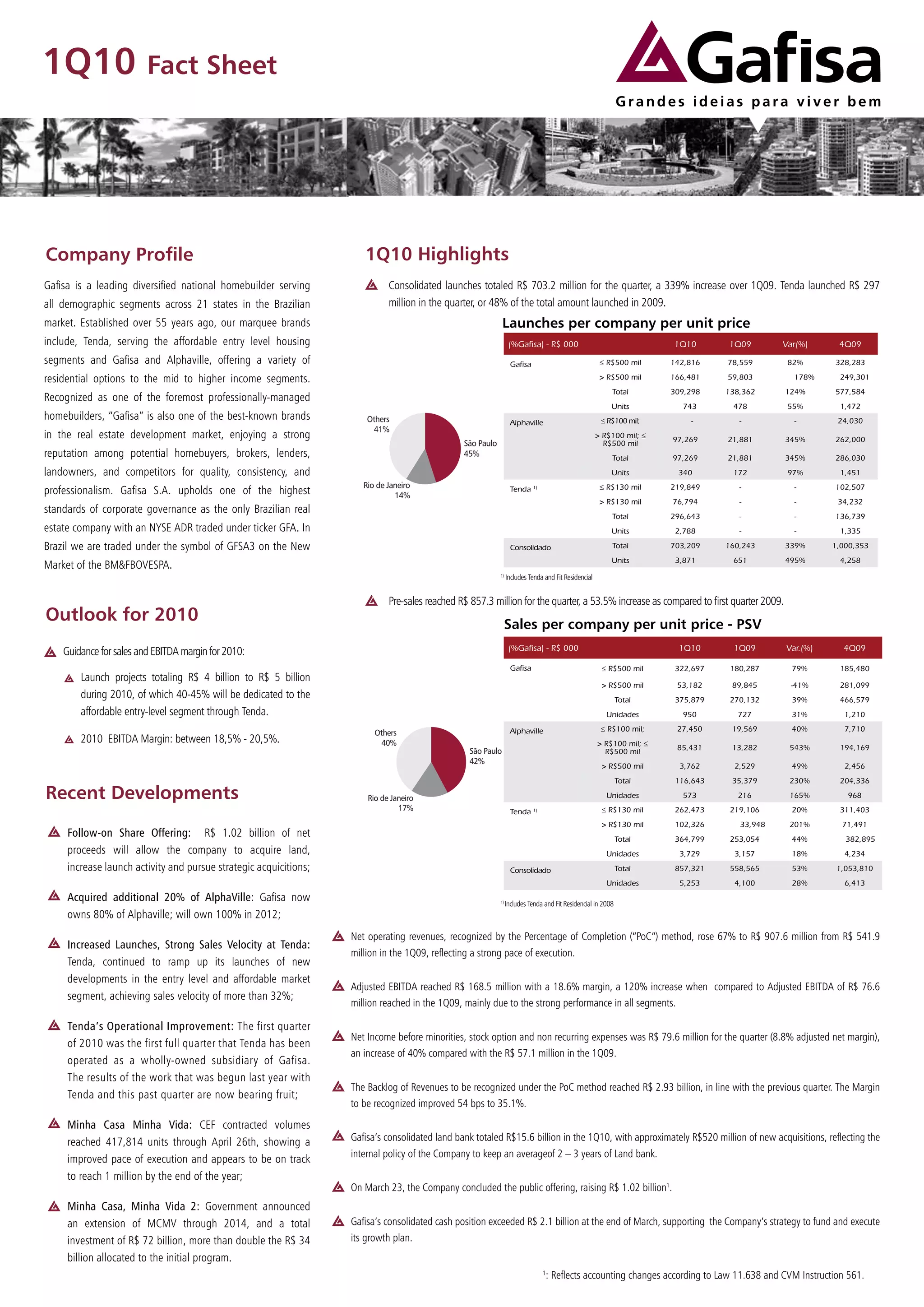 Gafisa reported strong financial results for 1Q10, with launches totaling R$703 million, up 339% YoY. Pre-sales reached R$857 million, a 53.5% increase YoY. Net revenue rose 67% to R$908 million, while adjusted EBITDA increased 120% to R$169 million with an 18.6% margin. Gafisa continued expanding its national footprint and consolidated land bank, which totaled R$15.6 billion. The company also completed a follow-on share offering that raised R$1.02 billion to fund growth initiatives.