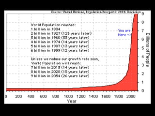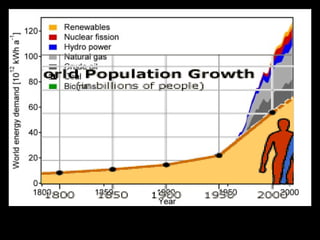Resources can be classified as energy resources and materials used by humanity. Population growth and urbanization increase resource consumption and pollution as more people live in cities, where residents use 40% more energy than rural areas. New York City alone produces 11,000 tons of waste daily. Humanity primarily uses energy for heating, construction, domestic use, electricity, and transportation, with major sources being fossil fuels like coal, oil and gas, as well as nuclear, wind, solar, biomass and hydroelectric power. However, dependence on finite resources like fossil fuels risks depletion and causes environmental issues like pollution and climate change.