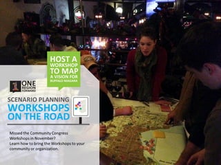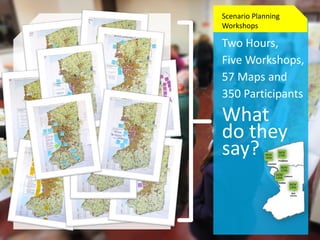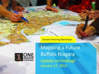 This document summarizes the findings of scenario planning workshops held across the Buffalo Niagara region. Over 350 participants attended five workshops and created 57 maps to envision what the region may look like in 40 years. The maps showed a strong emphasis on preserving existing communities, farmland, and open spaces. Participants prioritized revitalizing downtown Buffalo and Niagara Falls, and strengthening existing village centers. Connecting communities through improved public transit and trails was also a common theme. The document outlines where participants placed chips representing different development types and what new infrastructure like highways or transit they drew on the maps. Upcoming related workshops are also listed.