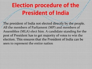 The document discusses the role and powers of the President of India. It states that the President is elected indirectly by Members of Parliament and state assemblies. Some of the President's key powers and duties include appointing the Prime Minister, chief justice, and governors, as well as signing bills into law and serving as commander-in-chief of the armed forces. However, the President exercises these powers on the advice of the council of ministers and is bound by their decisions, making the role largely ceremonial compared to presidential systems. The President can use discretion in appointing a Prime Minister if no party wins a clear majority.
