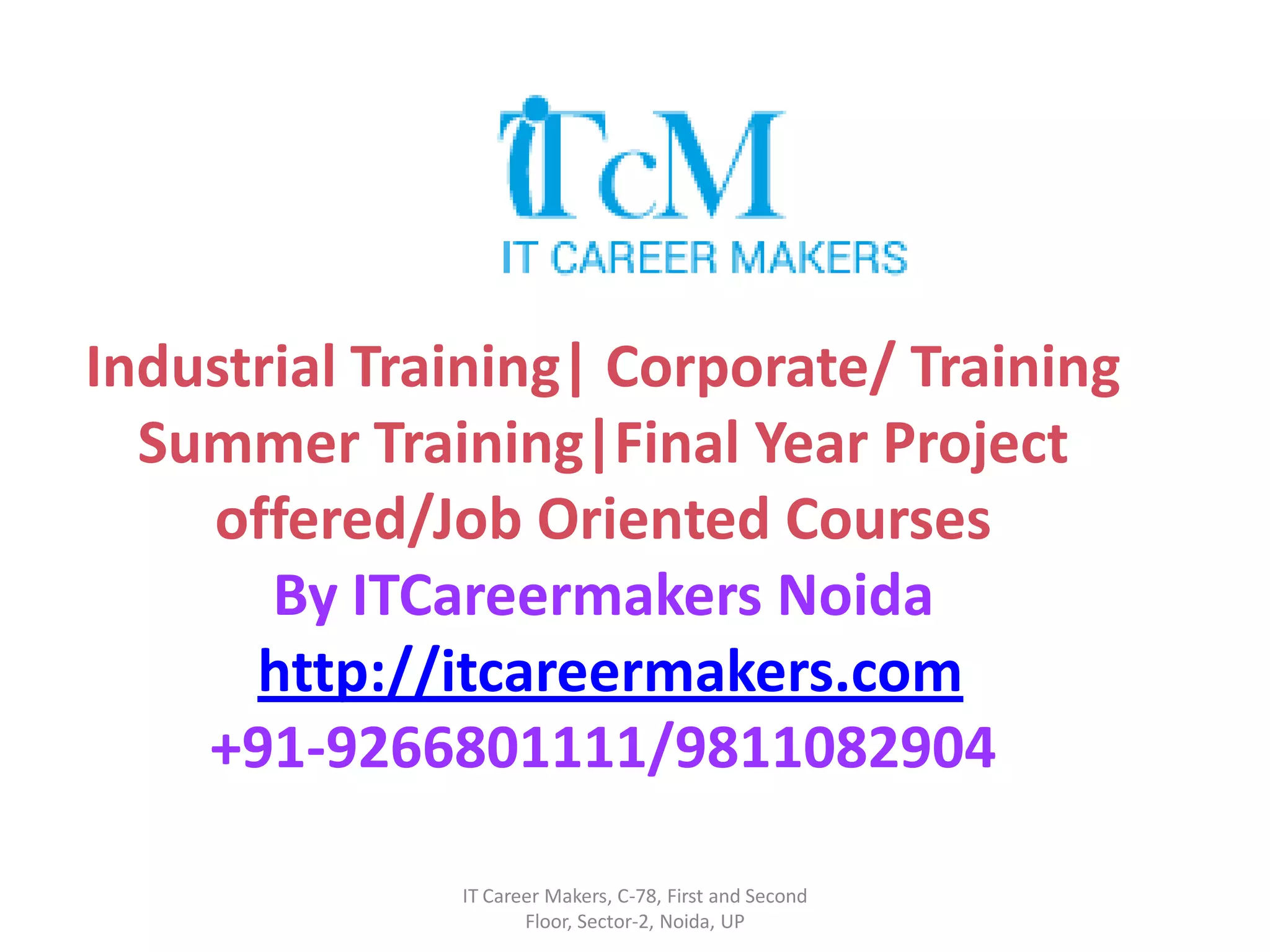 IT Career Makers is a training institute located in Noida, UP that offers job-oriented courses in technologies such as Java, C++, Android development, and software testing. The institute provides industrial training, summer training, and assistance with final year projects. Course fees vary from Rs. 2000-16,000 depending on duration and technology, and discounts are offered during Diwali. Trainers have 6+ years of corporate experience. The goal is to help students gain skills and experience to get placements through hands-on projects and interview preparation.