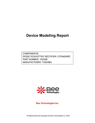 The document is a device modeling report for the 1SS396 Schottky rectifier manufactured by Toshiba Bee Technologies Inc. It includes detailed parameters for the PSpice model, circuit simulation results for forward current characteristics, and junction capacitance characteristics, with comparisons to measurements showing error percentages. All information is copyright protected by Bee Technologies Inc.