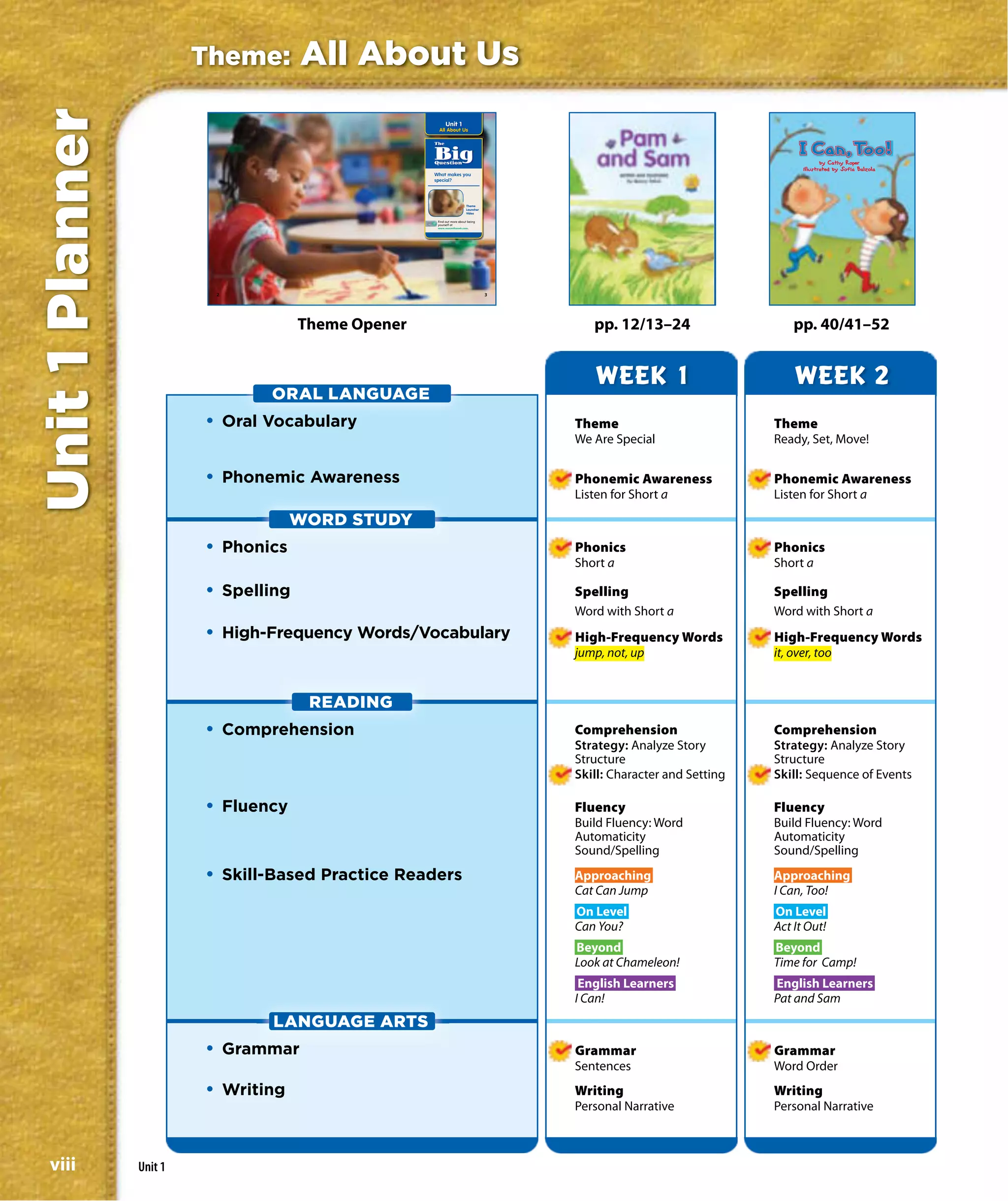 This document provides an overview of Unit 1 of an elementary reading curriculum. It includes the unit theme of "All About Us" and guiding question of "What makes you special?". It outlines the weekly lessons, including topics, skills, and stories covered in each week for oral language, word study, reading, and language arts. It also includes assessments to be given at the end of the unit.
