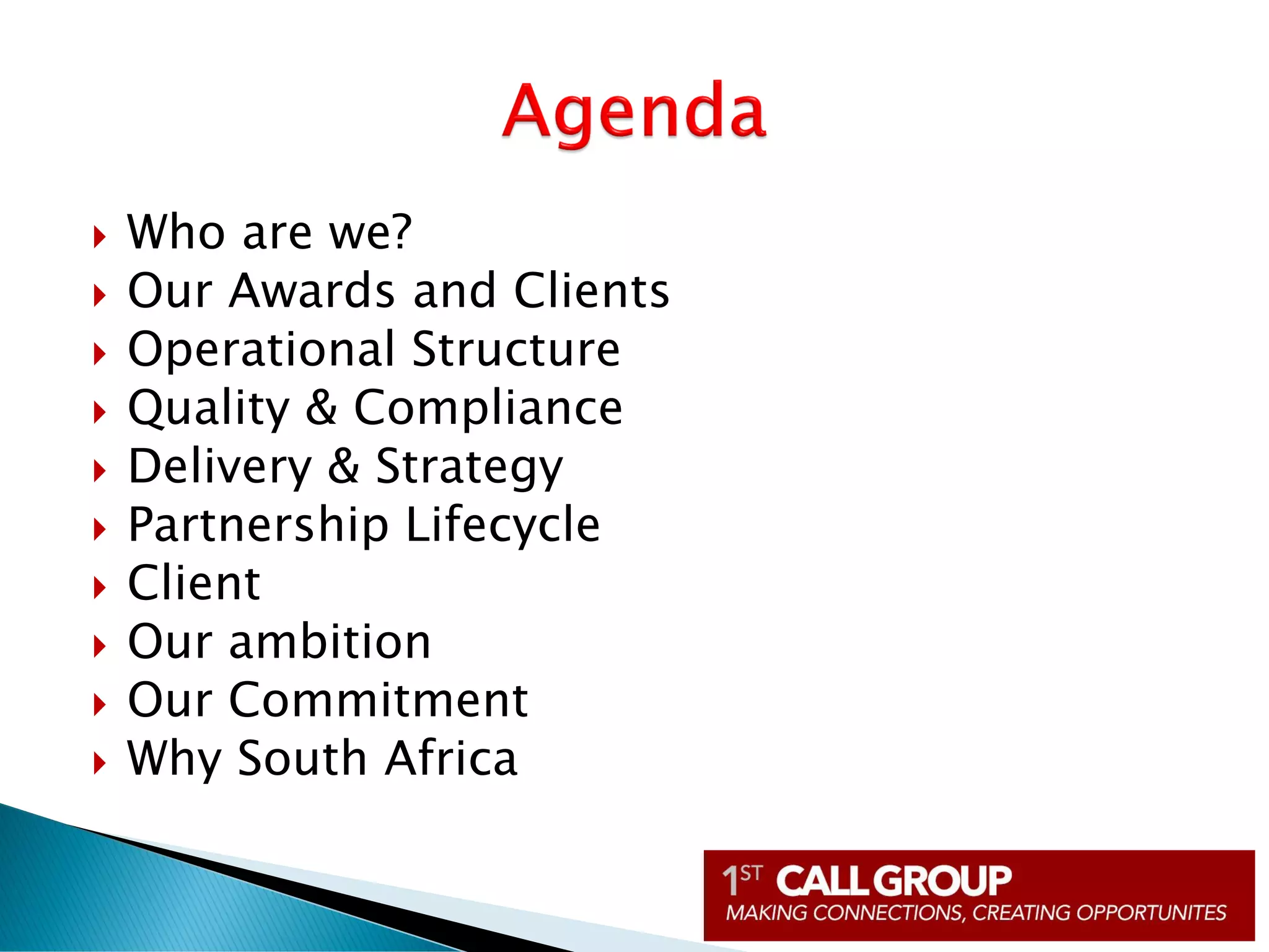 This document describes a market-leading call center located in Durban, South Africa. The call center has over 400 seats and experienced management with over 40 years of combined outsourcing experience. It provides complete customer campaign services and was awarded "Outstanding International Operator" in 2012. The call center offers onsite support, quality assurance processes, and partnerships to help clients maximize returns. Its goals are to deliver efficient, high-performing services and become a leading global business process outsourcing brand through long-term client partnerships.