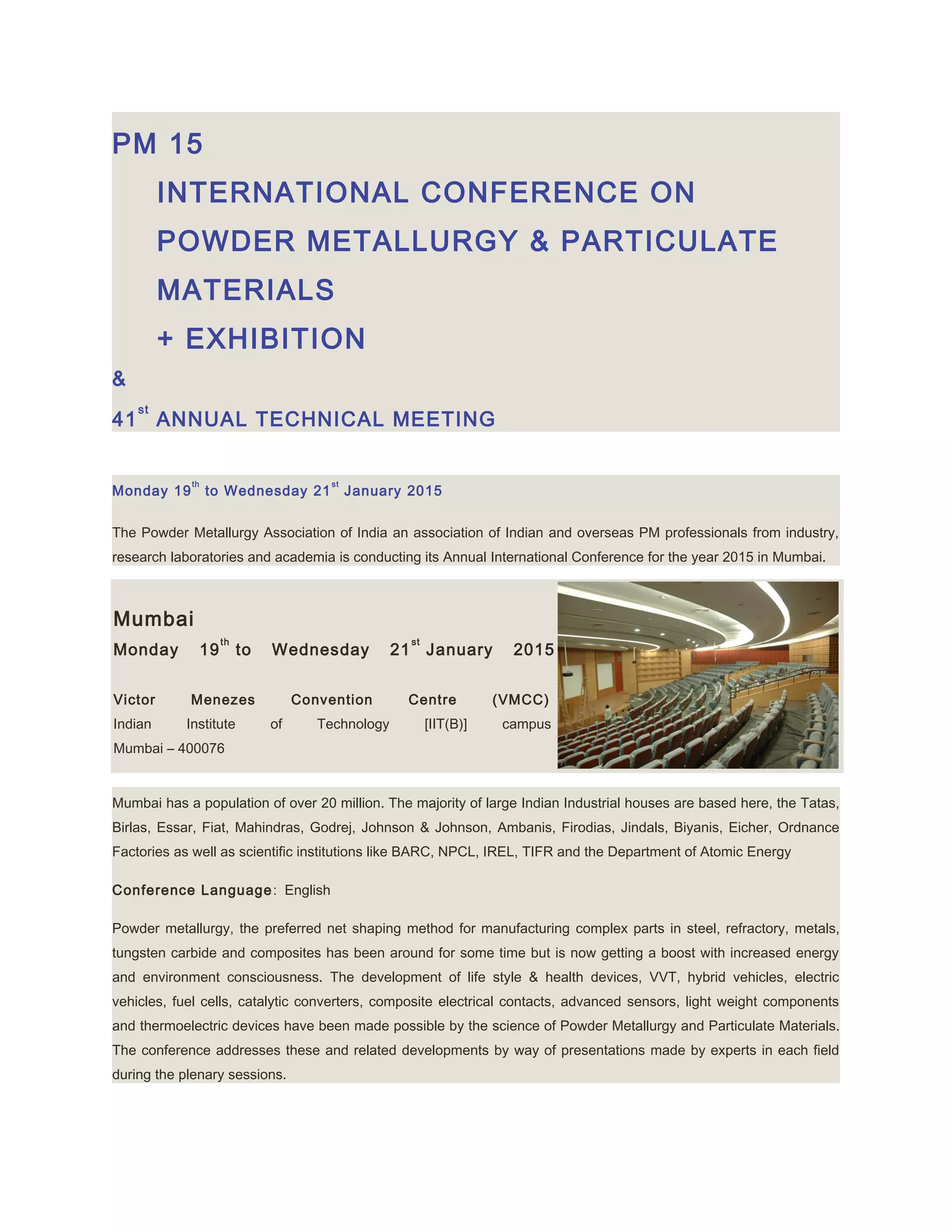 This document provides information about the upcoming International Conference on Powder Metallurgy & Particulate Materials to be held from January 19-21, 2015 in Mumbai, India. The conference is organized by the Powder Metallurgy Association of India and will include presentations on topics related to powder metallurgy and particulate materials. It provides details on registration, sponsorship opportunities, accommodation options, and includes the conference agenda, list of committee members and more logistical information.