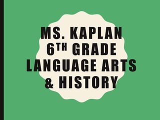 Ms. Kaplan is beginning her 12th year of teaching 6th grade language arts and history. This year she is joining Synergy Kinetic Academy, where she will teach these subjects. She earned her B.A. in Child & Adolescent Development from San Francisco State University in 2004. In her spare time, she enjoys volunteering at a bulldog rescue and going to Disneyland and the beach. The document outlines her class materials, rules, grading policies, and words of wisdom for students.